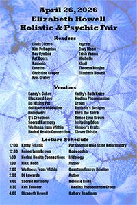 Here is a partial listing of my talented readers and their specialties: Karen Billings – Medium, Tarot Christine Gregor – Psychic, Palmist, Rev. Elizabeth Howell – Astrology, Greg Nicholas – 4th Generation Rev. Theresa Manjas – Astrology, Kim Pelagrino – Psychic Medium, Peggy Pogan – Medium, Jo Schrader – Medium, Rev. Cynthia Lou – Psychic-Intuitive Sandra Youngblood – Animal | Here is a partial listing of my great vendors and their websites (where available):ERS Inc – www.biofieldenergy.com Midway Metaphysical – Store HempWorx – CBD and more One Mind Reiki Namaste Life Center – Store Paparazzi – Nicole Calabro Made By Mabel – Handmade hand drawn reiki and moon charged items Color Street Nails doTERRA – Essential Oils Eyes About You– Iridology |