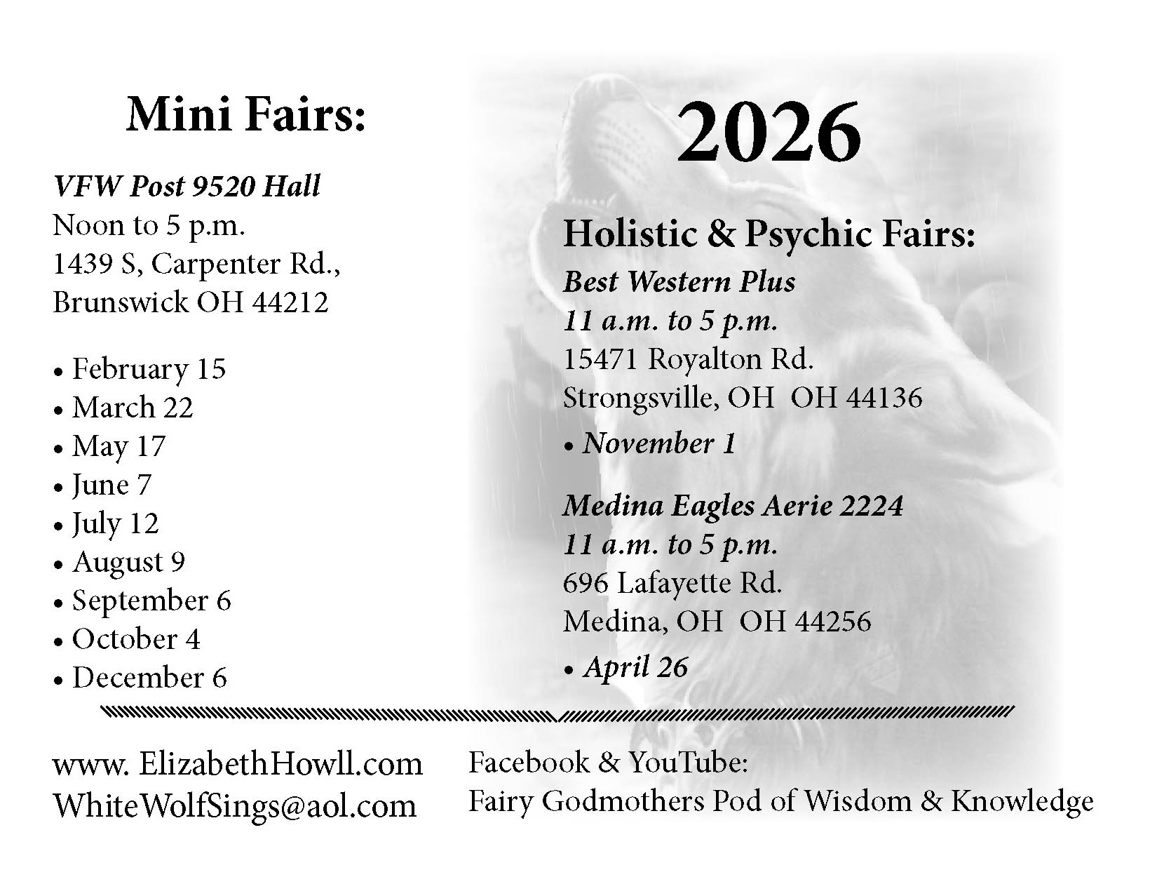 Here is a partial listing of my talented readers and their specialties: Karen Billings – Medium, Tarot Christine Gregor – Psychic, Palmist, Rev. Elizabeth Howell – Astrology, Greg Nicholas – 4th Generation Rev. Theresa Manjas – Astrology, Kim Pelagrino – Psychic Medium, Peggy Pogan – Medium, Jo Schrader – Medium, Rev. Cynthia Lou – Psychic-Intuitive Sandra Youngblood – Animal | Here is a partial listing of my great vendors and their websites (where available):ERS Inc – www.biofieldenergy.com Midway Metaphysical – Store HempWorx – CBD and more One Mind Reiki Namaste Life Center – Store Paparazzi – Nicole Calabro Made By Mabel – Handmade hand drawn reiki and moon charged items Color Street Nails doTERRA – Essential Oils Eyes About You– Iridology |